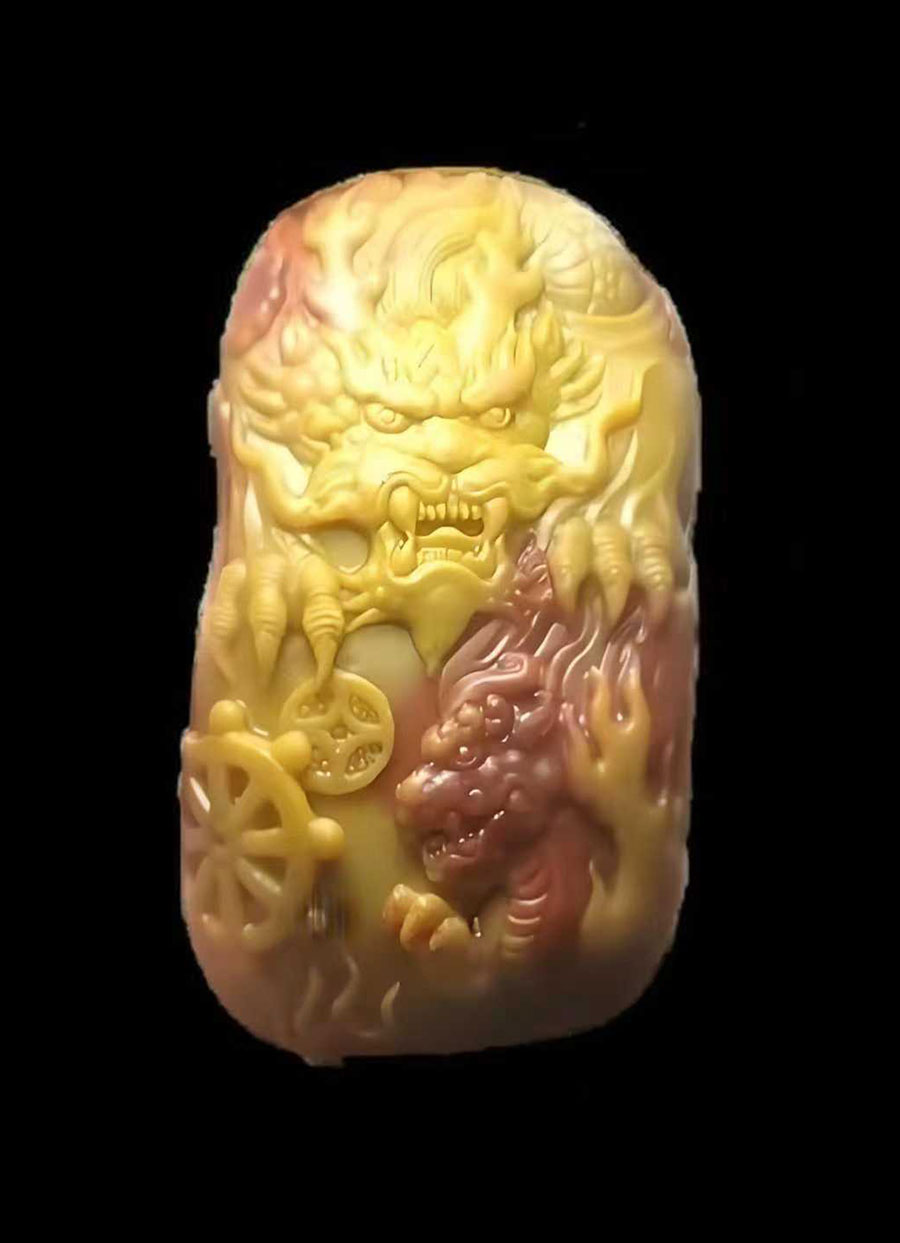 这件玉雕作品龙形为载体,聚焦龙这一中华传统文化核心图腾,将龙的威严、灵动与文化寓意凝练于方寸之间。以立体圆雕呈现,主体为昂首怒吼的龙形,龙首鳞甲、利爪等细节刻画细腻,尽显龙的威严与力量,辅以云纹、瑞兽等传统纹饰,既丰富视觉层次,又强化龙在文化语境中权势、尊贵、丰收的象征意义。保留玉石温润质感,又借色彩传递祥瑞气韵,呈现出传统工艺与自然材质的完美结合,兼具艺术观赏性与文化传承价值。