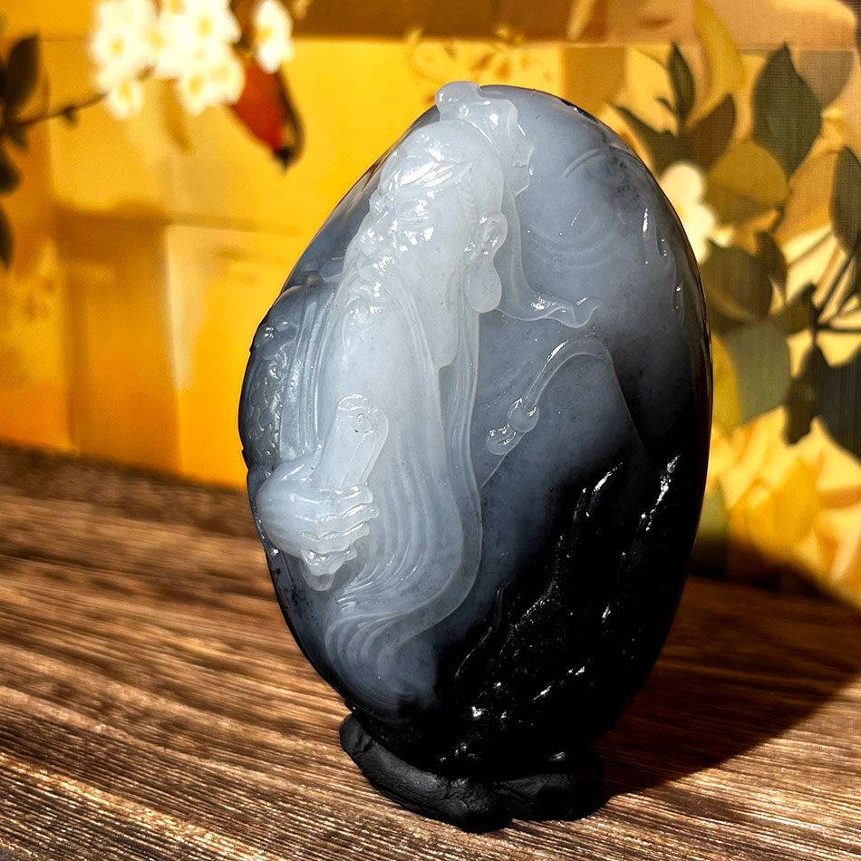 关羽,他是武圣,是关圣帝君,是伽蓝,也是汉寿亭侯。是自己很喜欢的一个人物题材,这件籽料青花的原材料,黑白俏色摘出人物主题,设计的是关羽夜读春秋,这时的关羽不只忠义勇猛,更是充满智慧。