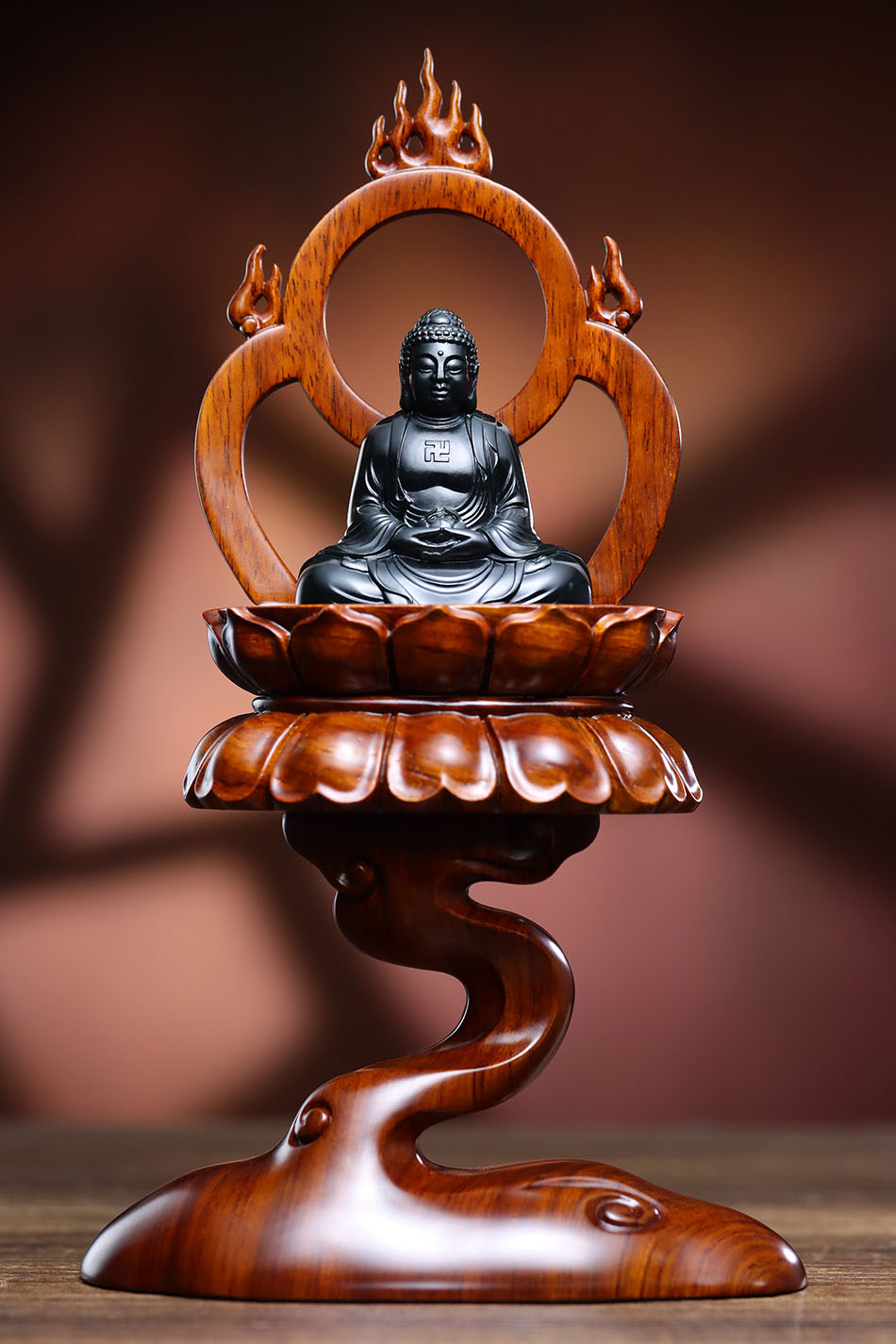 主体是黑色佛像,搭配木质底座与背光。常用于佛堂供奉、家居装饰等,传递宗教文化与艺术审美 。