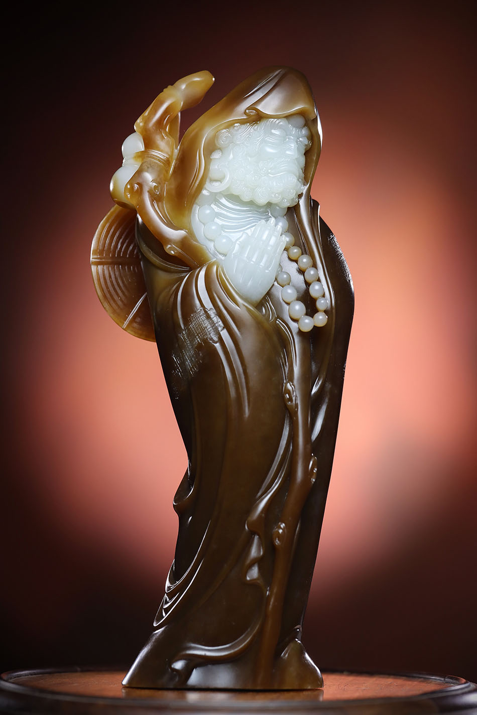 和田玉雕刻的达摩像,利用糖玉巧色雕琢,呈现达摩身披长袍、手持法器、神态庄严的形象,是玉雕艺术中宗教题材作品,体现传统工艺对达摩形象的塑造与文化内涵传达。
