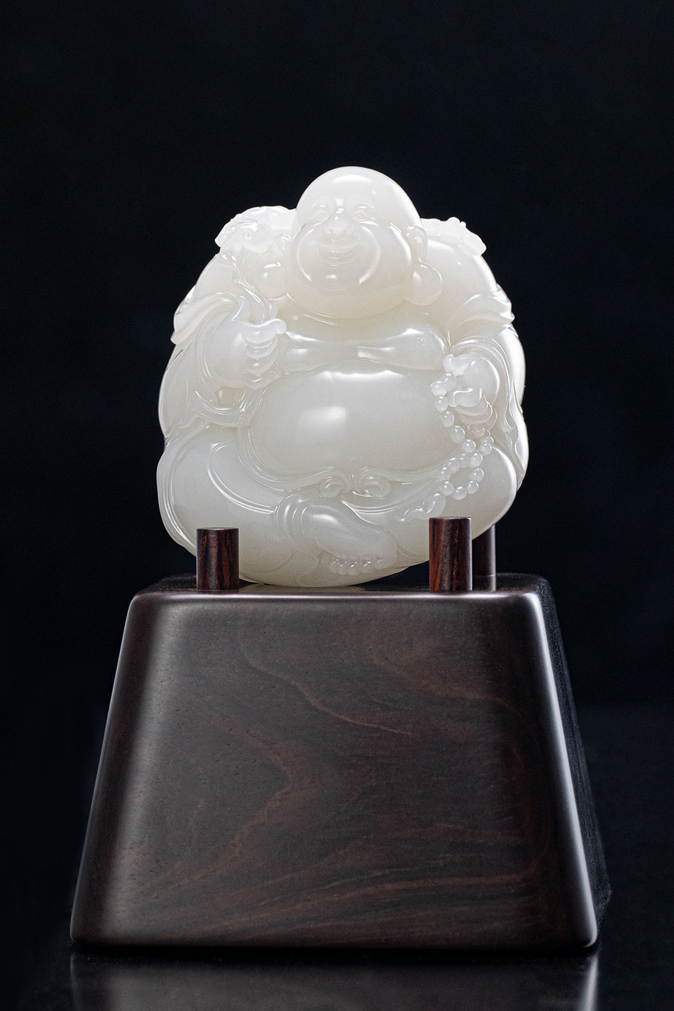和田玉佛像摆件,不仅经过雕刻能够成为精美的艺术品,就连其自然未经修饰的纹理,都透露着颇为高雅的气质。玉雕佛像通常造型饱满、细节丰富、神情自然传神,因此许多玉石爱好者热衷于收藏。玉雕佛像常具有型、艺、材俱佳的特色,不仅可以作为一种高档的陈设艺术进行摆放,让人驻足欣赏,同时,作品中也含有如意吉祥的美好寓意。玉是传统文化的精髓之一,有佛护佑,福泽绵延,喜乐常伴。