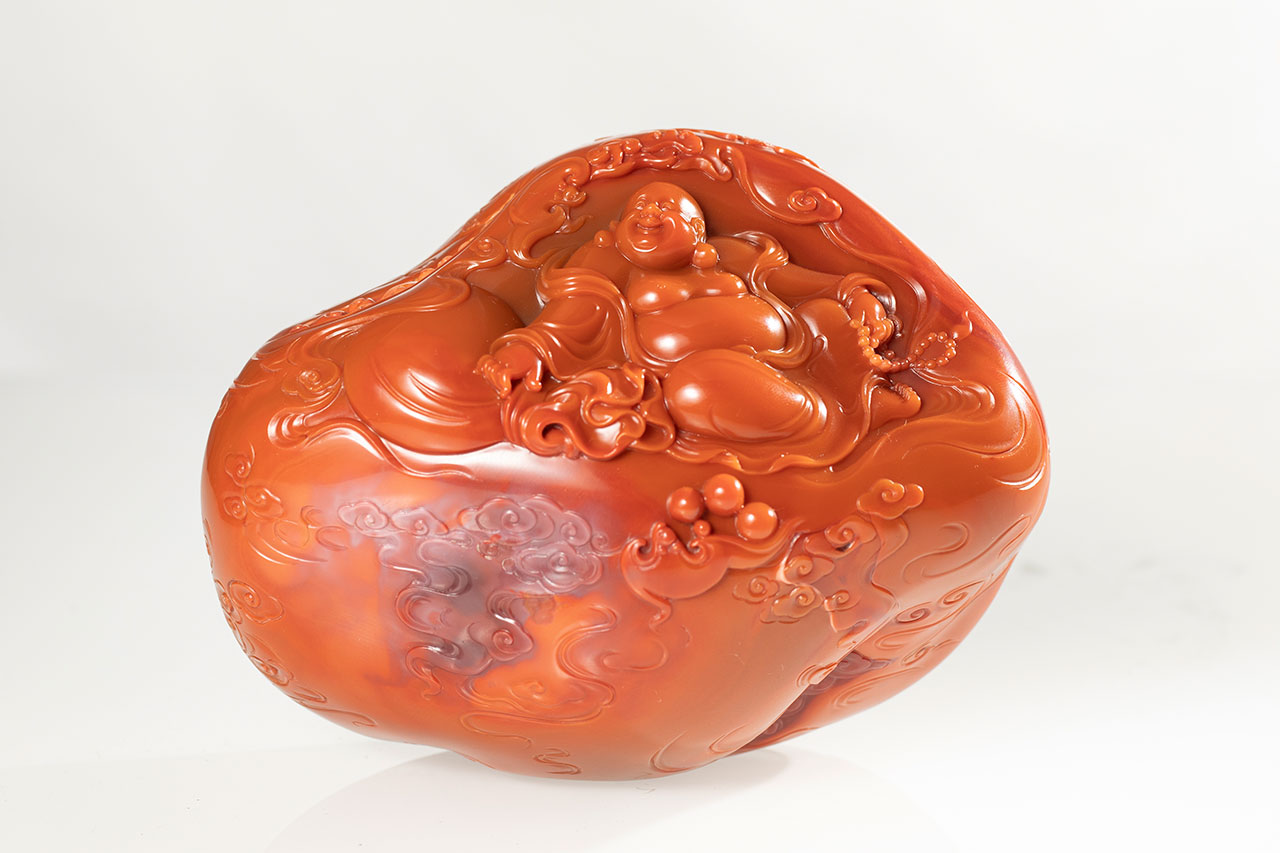 南红弥勒佛颜色均匀、玉质细腻、红艳喜人。红红火火配上大肚能容、笑口常开的弥勒佛,更显喜庆吉祥,鸿运满堂,时时佩戴把玩,南红颜色越正,升值越高,又得喜乐常在,仿佛能够通过弥勒佛自然通透的笑容,豁达乐观的慈悲佛心,看透繁华世间的迷茫和焦虑,将喜乐、欢喜直接传递到有缘人的心上。