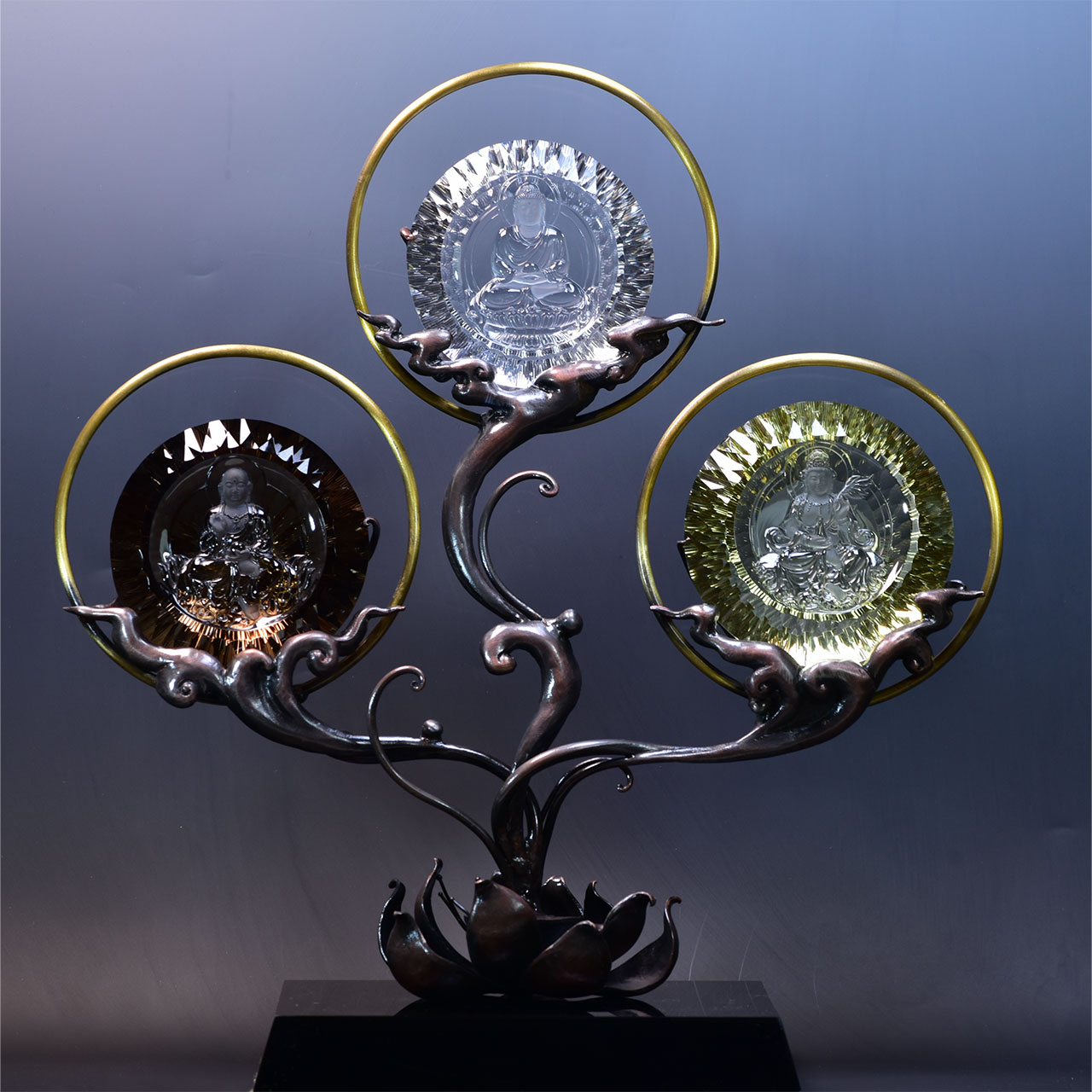 此作品采用天然水晶三色组合为载体,选用“娑婆三圣”为创作主题,选用天然白,黄茶三种颜色的水晶,在外形上大胆的采用钻石工艺的刻面,利用水晶的光线折射使雕刻的主题具有时尚感和神秘的色彩。底座利用金属铜做旧工艺,三尊端坐云端,雕刻才有深浮雕加上亮光和磨砂工艺,首先看到整件作品使人具有时尚感,近看作品庄严肃穆,法相端庄气势恢宏,格调高雅,造型优美。