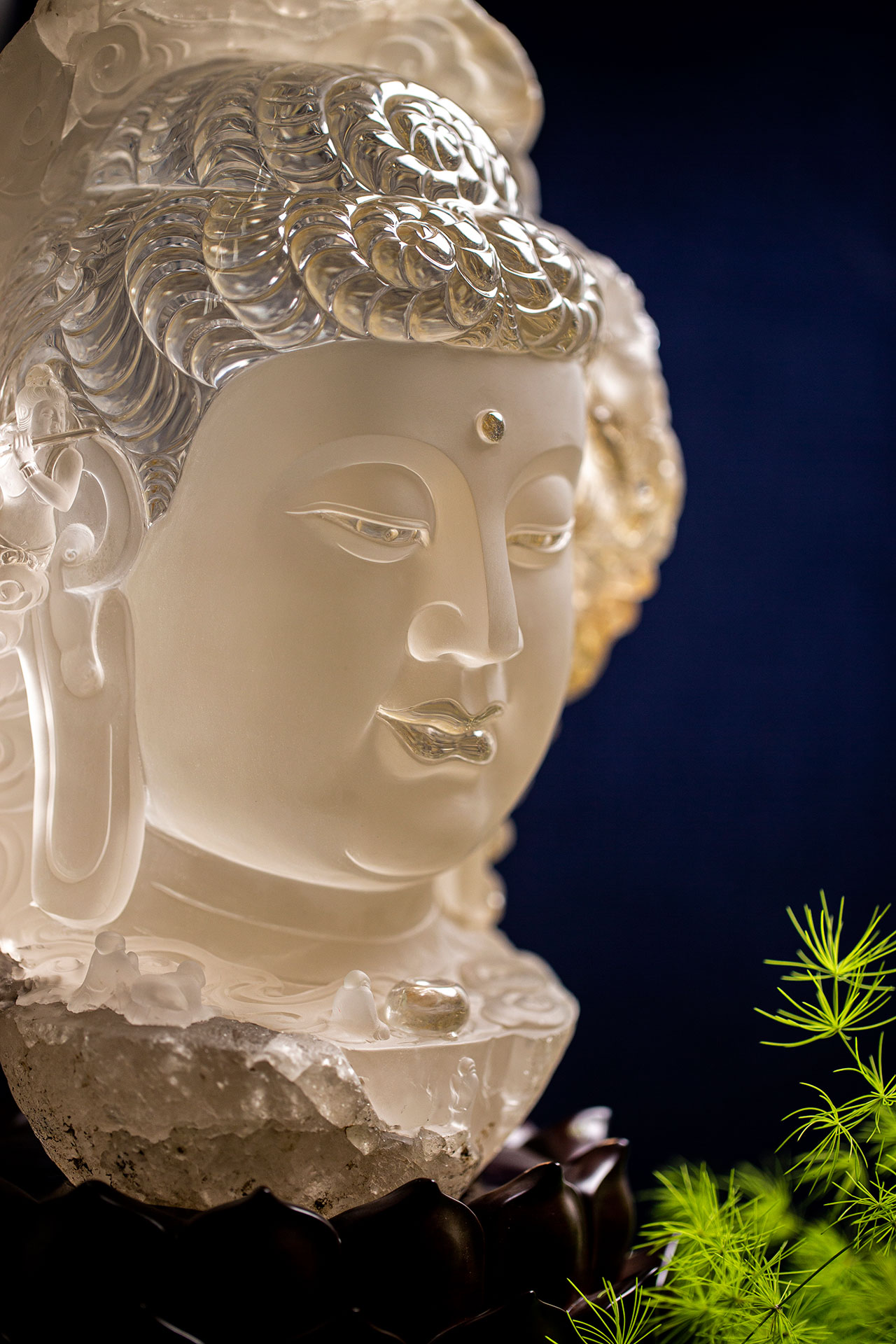 此作品是由天然水晶河床料雕刻。以释迦摩尼法相为主题,选用原石最好的部分雕刻为佛首,两边设计制作两个飞天,左边从天而降吹笛子,右边悠然升空反弹琵琶遥相呼应,为佛陀演奏天籁之音,使作品产生了流动感和美好繁荣的景象。佛像下边雕刻的有朝拜、坐禅,还有从山下走来的朝拜者。这些人物雕刻很小,佛像很大形成了大的对比,使作品空间巨大,整个画面场景呈现出一个世外圣境,反映了人们对精神的追求和对美好生活的向往。