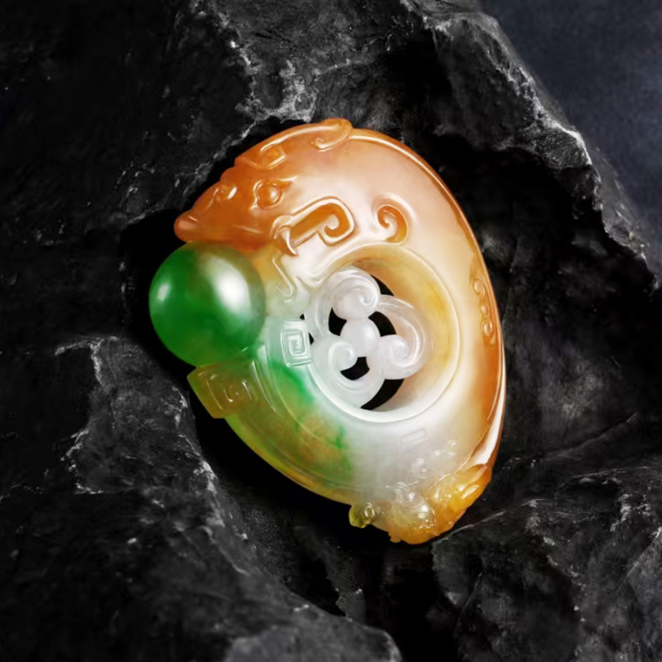 创作构思:根据三彩翡翠中绿色、黄色的分布位置与形态精准设计。绿色部分被打磨成珠子,黄色部分运用浮雕与圆雕结合的技法,细致刻画玉猪龙头部五官和纹理,用阴刻线条勾勒眼部轮廓,浅浮雕塑造耳朵与吻部。挂件牌中间的花纹部分采用镂空雕刻技法,雕琢出线条流畅,边缘打磨光滑,借助光影穿透效果增加作品层次感与立体感,展现翡翠的通透之美。