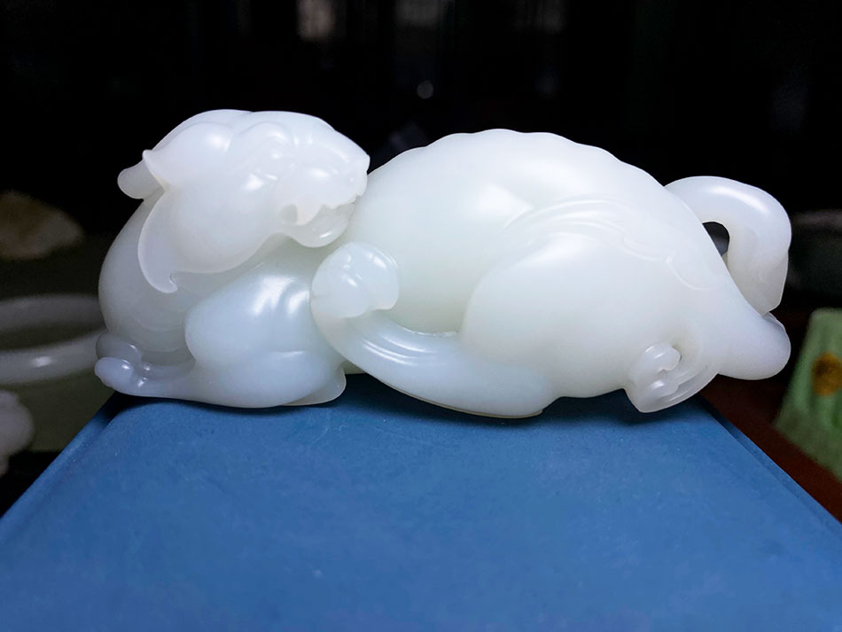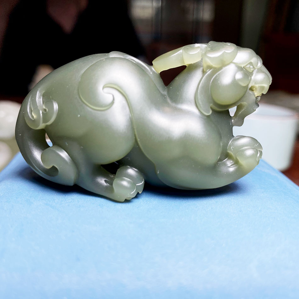 和田玉貔貅,采用一块和田玉立体圆雕的形式雕刻出一个灵动的貔貅,作品雕刻布局结构合理,动作灵动而不失霸气,线条流畅,层次清晰,以玉雕的形式,使得作品达到玉雕作品的材质美、工艺美的完美结合。