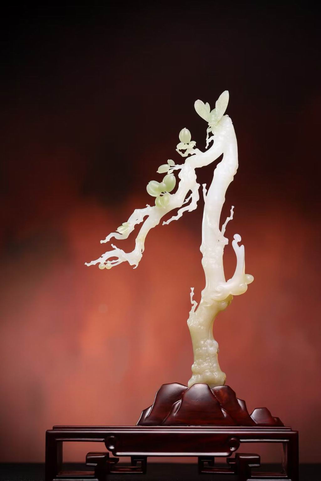 温润美玉,精琢成枝。看那灵动的花苞与叶片,似在微风中轻颤;精巧的玉蝉,仿若下一秒便振翅欲飞。生机勃勃的景象中一名修士悟道而行,不知是因景入道还是因悟道而成景。于深沉的底座衬托下,这方玉雕自成天地,凝萃自然之美,尽显岁月的诗意与匠心的独运。