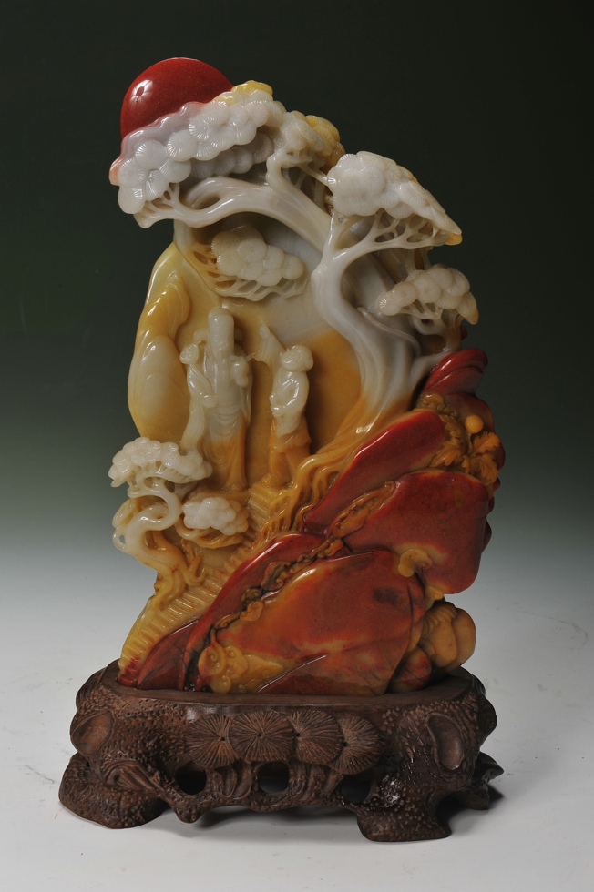 评语:作品指高升,以黄.红.白三色密玉为原料,巧妙的色彩运用,米黄色主体颜色,白色的松树,一轮旭旭上升的红色太阳,构成一幅欣欣向荣的景象.寓意步步高升,整件作品构思巧妙,布局合理,层次分明,实属密玉之佳作。