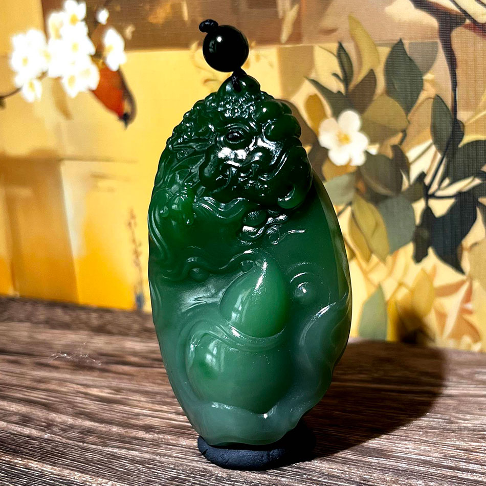 福禄寿,(蝙蝠,葫芦,兽)这件以俄罗斯碧玉三色过渡料为原材料设计的手把件,以三色为层次雕刻出三个主题,兽眼运用到原料的一点褐红斑,对外形大小的把控也是可把可带。