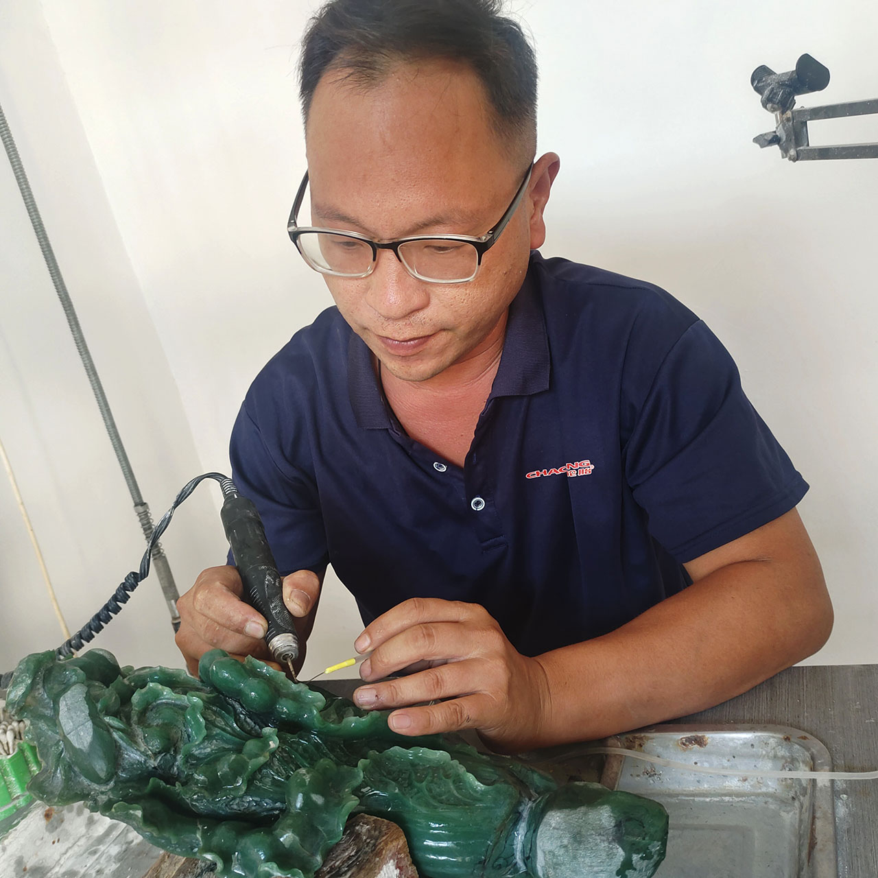 周军营,男,1984年生,河南济源人。高级技师(工艺品雕刻工),河南省玉石雕刻大师。2001年,考入新密市雕塑艺术中等专业学校,师从陈桂鑫大师,开启系统化学习之路;2004年毕业后,进入新密市红星玉器厂,拜师崔金石大师;2012年转至珍宝阁玉器厂,师承司景周大师;2016年加入精特玉道文化传播有限公司。
