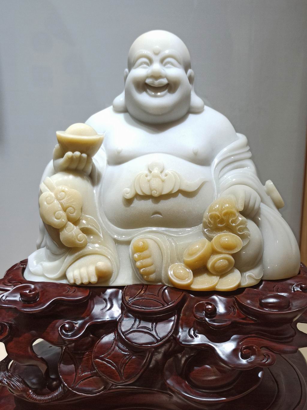 弥勒身披宽大僧袍,衣褶流畅自然,领口与袖口边缘绣有暗纹,衣料质感轻盈,似随风微动。衣褶、手持物等处略施深色阴影,增强立体感,但整体色调统一,避免突兀对比。此造型融合了佛教“慈悲为怀”的教义与民间“福禄安康”的祈愿:圆润体态象征无碍自在,宝瓶与佛珠代表智慧与修行成果,底座纹饰则呼应佛教宇宙观,整体传递出对未来圆满的期许。