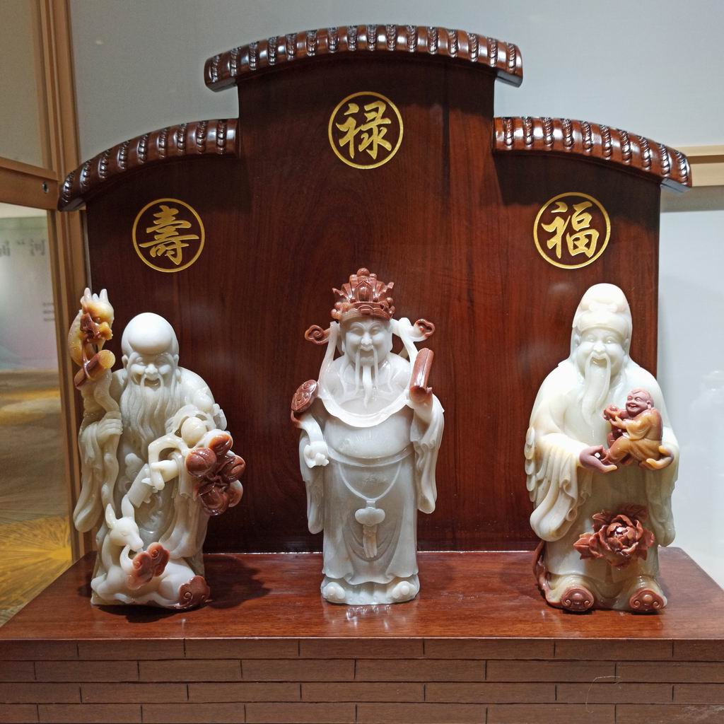 《福禄寿三星》作品采用密玉,以浮雕、透雕技法呈现衣纹与细节,线条圆润细腻。三人呈“品”字形排列,寿星居中,禄星、福星对称分布,形成和谐构图。