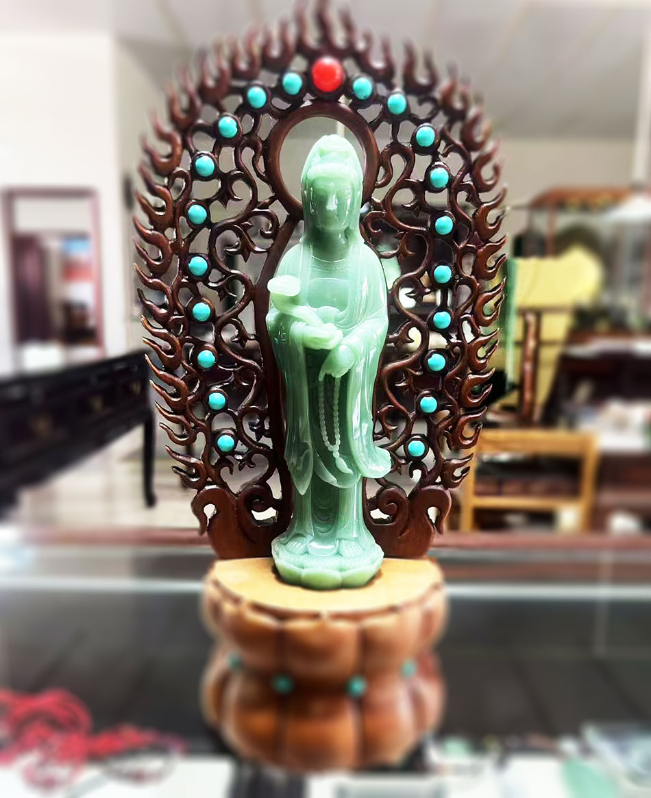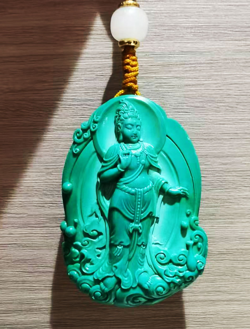 作品以一块天然高瓷绿松石为原材料,以传统观音形象为核心,将慈悲济世的寓意与灵动飘逸的视觉美感相结合,传递出超凡脱俗的东方美学意境,赋予冰冷玉石的人文关怀,作品采用高浮雕技法突出主题,配合浅浮雕的云纹美景 通过层次对比增强画面的立体感!