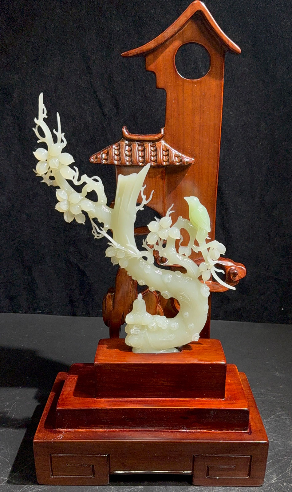 当玉的温润包裹了菩提的苍劲,当翠鸟的灵动凝固了禅心的寂静,这件青白玉雕便不再仅是掌中之物。它凝固了树影、鸟鸣、老者的呼吸,让刹那顿悟的澄明瞬间化为永恒。它无言地立于案头,却以玉的温润与禅的深邃,在方寸之间照见天地,让观者得以片刻栖身于喧嚣之外——此乃玉魄禅心共同构筑的永恒菩提境。