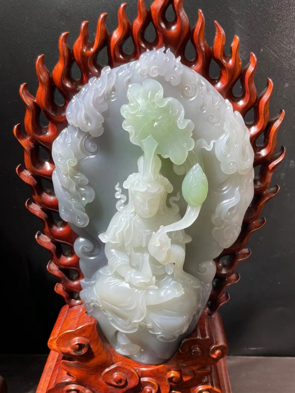 作品的核心,在于凝固观音菩萨“寻声救苦”的慈悲本怀,并借玉之三色,具象化展现佛法的清净、智慧与庄严。白色观音法相是主题的灵魂:其盘坐之姿如须弥安住,传递无上定力;低垂慈目与温婉面容,是“千处祈求千处应”的悲悯凝视;右手托起的净瓶,盛满甘露法水,象征涤荡尘垢、普润群生;左手轻拈的翠色莲苞与荷叶,则是最精妙的点题——莲乃“花开见佛性”的圣物,此未放之花苞,既寓意众生本具的清净佛性(菩提心)有待开发,也暗含无限生机与未来圆满的希望。背后升腾的紫色背光,以祥云烘托神圣,以火焰纹饰(常代表智慧光明)象征般若之智的无边炽盛。白(清净法身)、翠(生机佛性)、紫(智慧光明)三色交融辉映,共同构筑了一个具象化的“人间净土”,宣说着悲智双运、自性本净的深邃佛理。