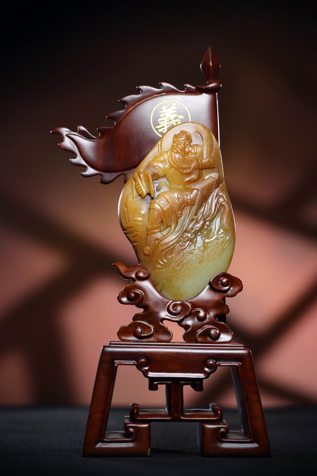 创作主题:以关羽为核心形象呼应传统文化里的忠义的内涵,借和田玉温润.耐久的特性,让义的文化符号通过玉石雕刻传承。利用料子的天然皮色,形状,巧雕人物,纹饰,保留原石部分材质,展现自然之美与人文巧思的碰撞。凸显在东方审美中对自然的敬畏与艺术化的表达。