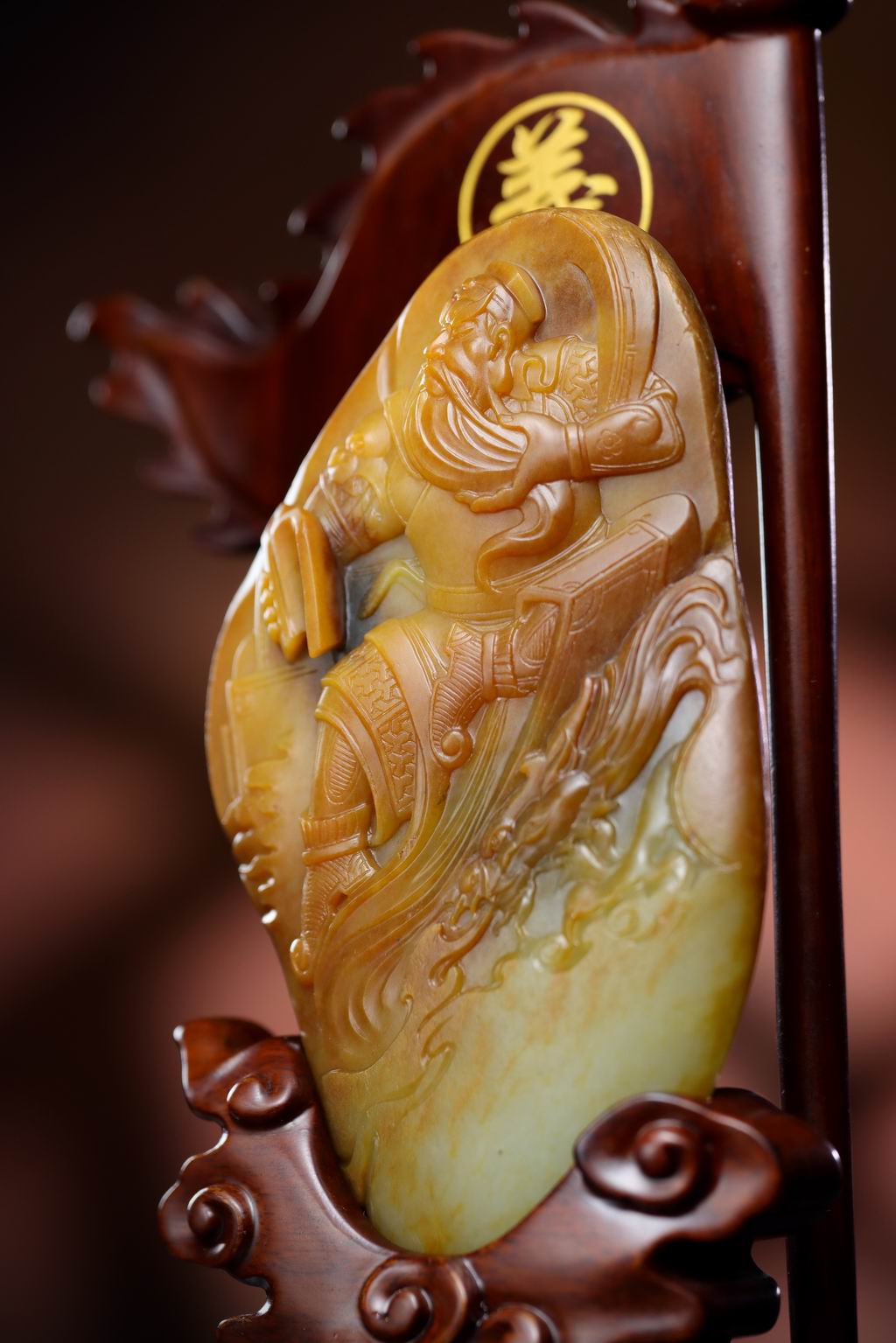 忠义千秋的创作灵感:这件关公的创作灵感主要来自这块料子的天然外形和天然的沁色。玉石温润有质感,适合雕刻人物,利用料子的天然色泽和纹理,能够生动呈现关羽的神态,服饰等细节。让忠义的形象借玉石的温润与厚重更显立体。