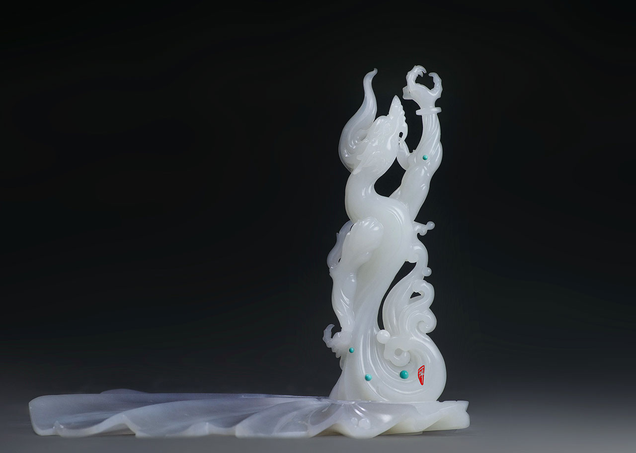 《摘星》作品为组合件,主体龙形择白色玉料雕琢,底部为淡墨色漩涡亦是底座。温润质地与灵动造型相融,开启一场视觉与精神的双重漫游。