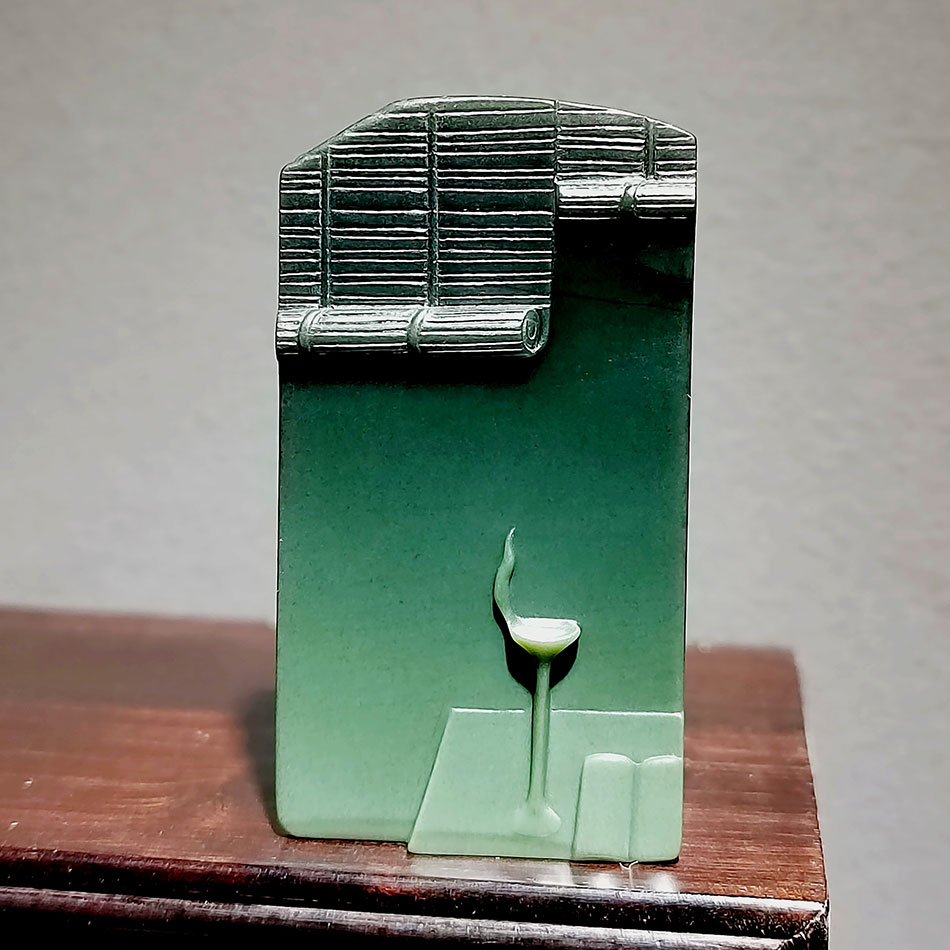 作品~夜读~浮雕竹帘案台烛台书本,表现一副灯下夜读的画面。料子上部色黑重,下部色浅,上面黑色如窗外漆黑的夜晚,烛台的设计又使得下方浅色如灯光所照,使得作品平添许多情趣