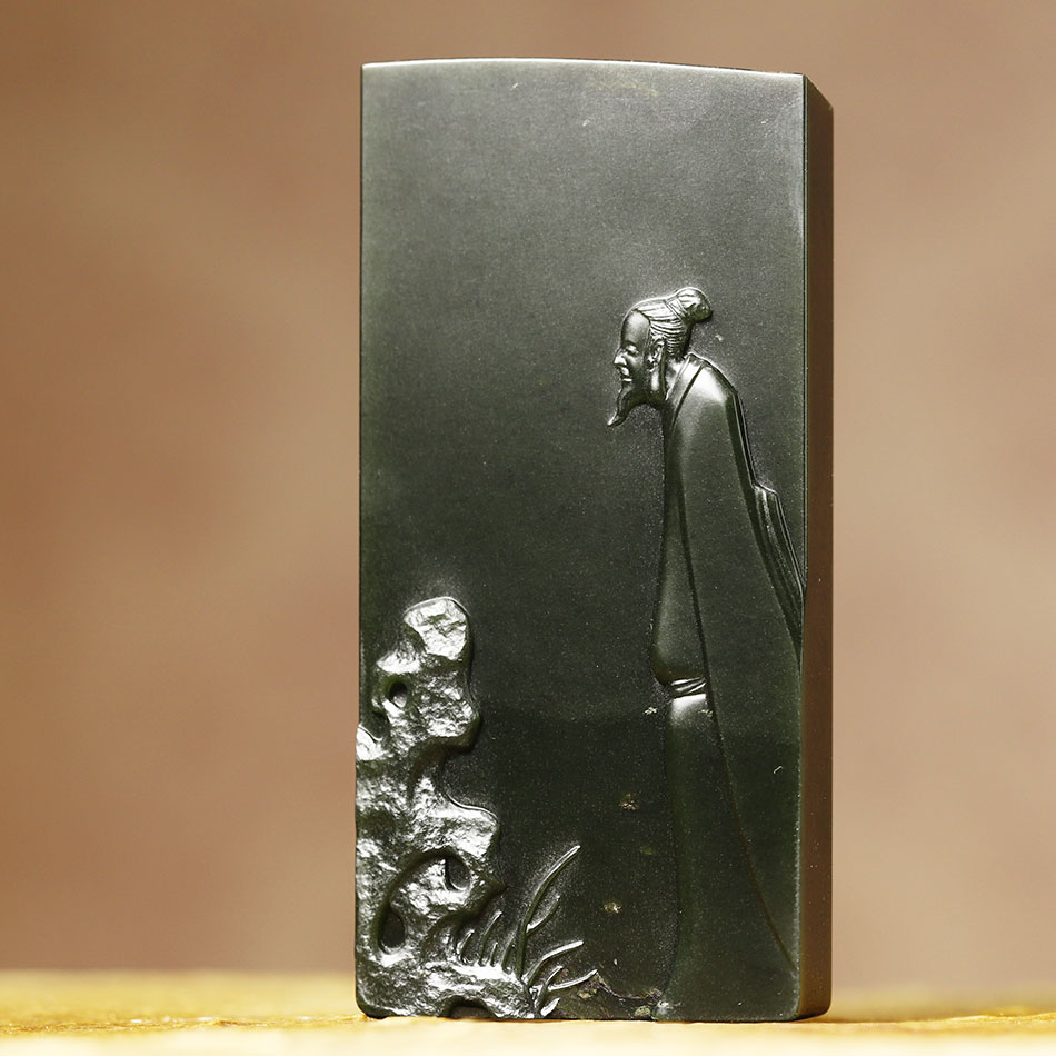 作品~问石~采用和田玉籽料创作,浮雕手法雕刻一文人立与石头旁,低首若语,人物大面留白体现儒雅不世俗,相问于石并借石喻人,传递高雅志趣,亦是对人生境界的隐喻。