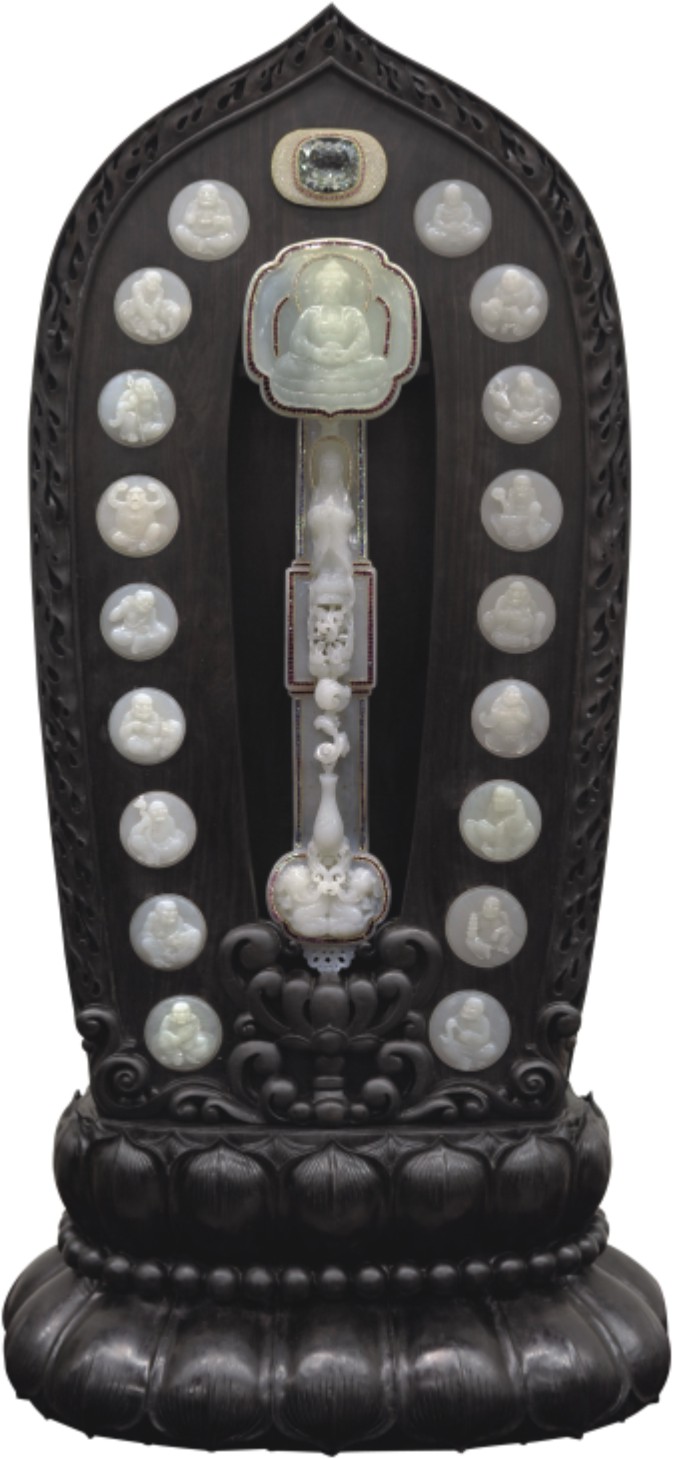 评语:意化佛缘。继承传统且独具新意,这是作品给观者的第一印象。造型周正端庄,选材考究精良;远观有势,近看有工;十八罗汉胜似众星捧月,佛家如意亦是如意佛家。为当代玉雕文化、创意、艺术、手法之优秀作品。